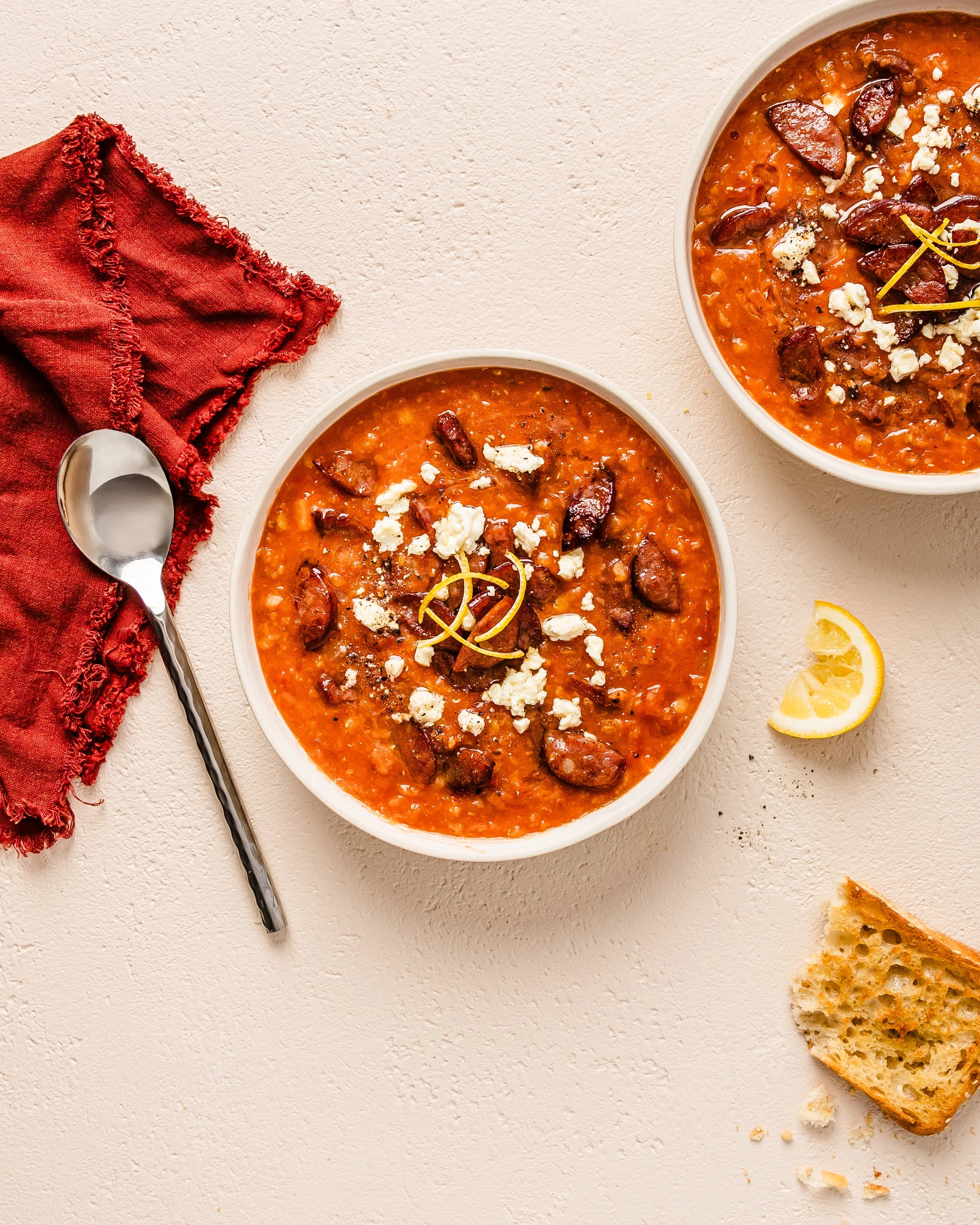 To serve, ladle soup into bowls, add a squeeze of lemon juice and top with remaining chorizo, lemon zest and crumbled feta. Serve with grilled Turkish bread.
